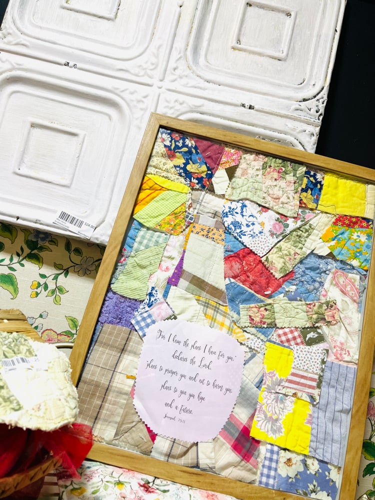 Framed quit Textile ArtA one-of-a-kind faith piece made with layered vintage fabric scraps, each strip telling its own story. Soft florals, plaids, and timeworn textiles come together in a beautifully distressed frame, finished with the simple yet powerful word of scripture.