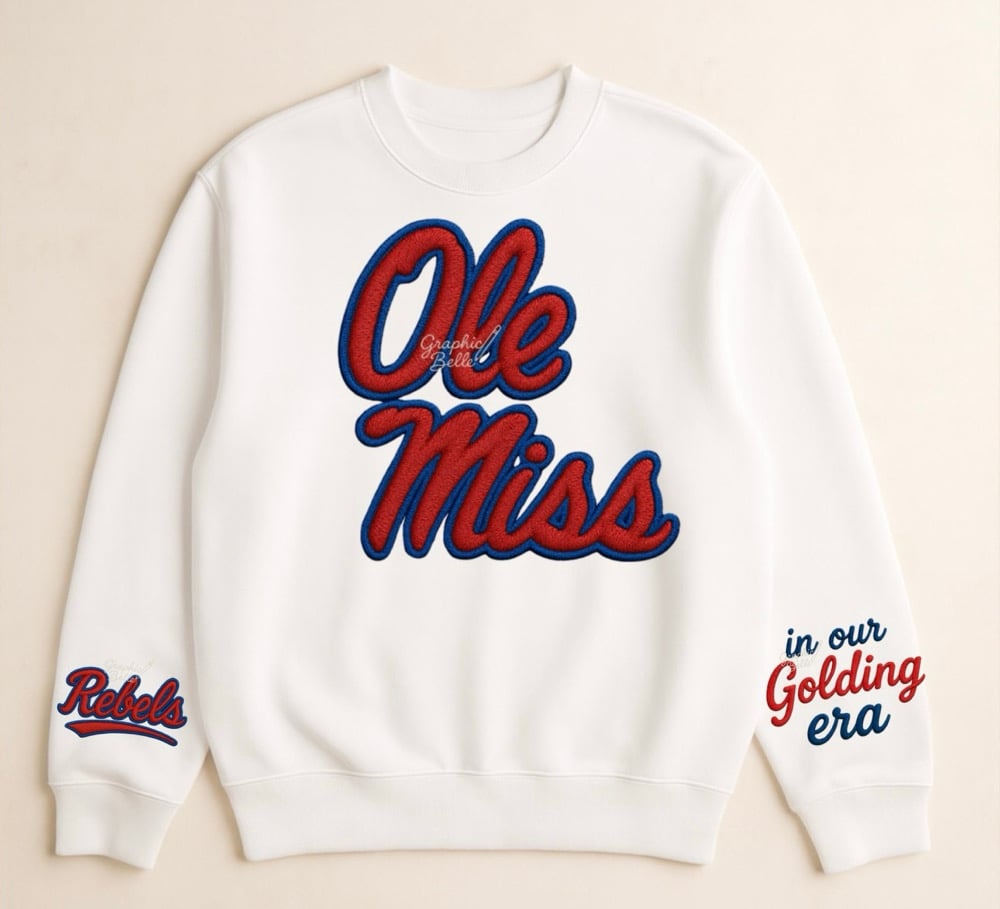 White sweatshirt ole miss faux yard on front, rebels on sleeve, in my golfing era other sleeve
